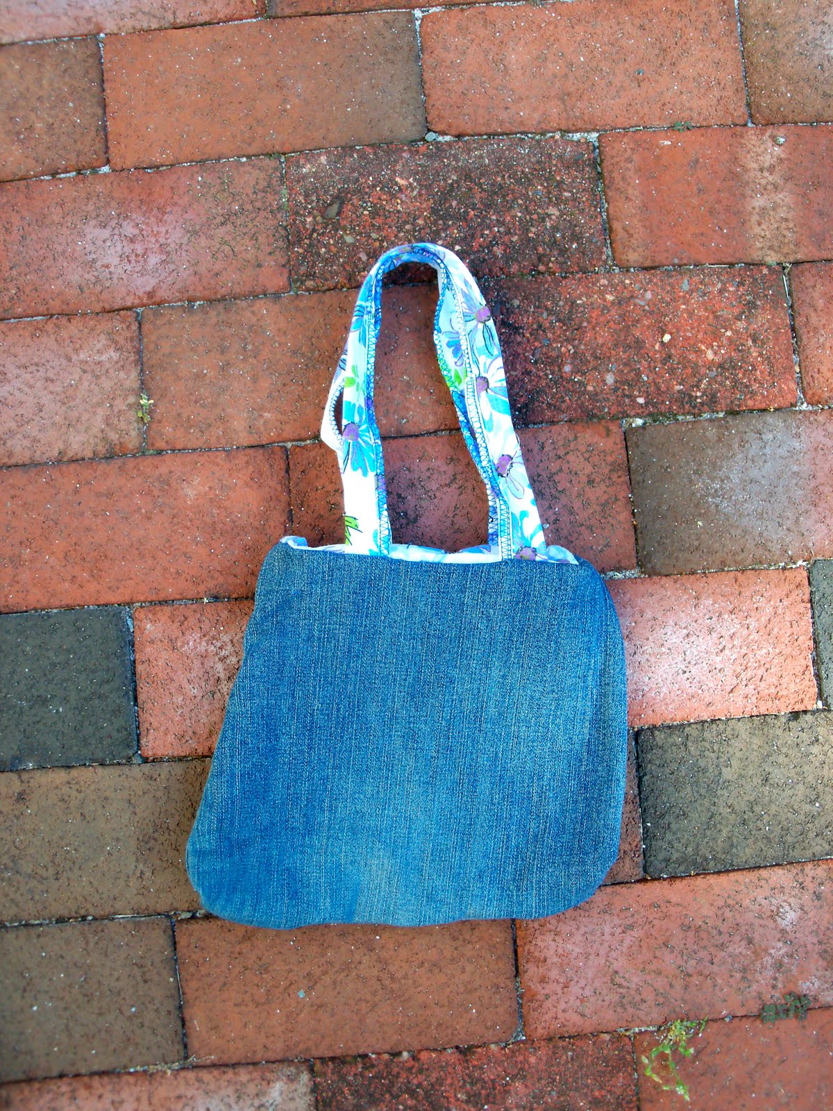 This one is unlined with a button closure. The handle is made from the top of the jeans.